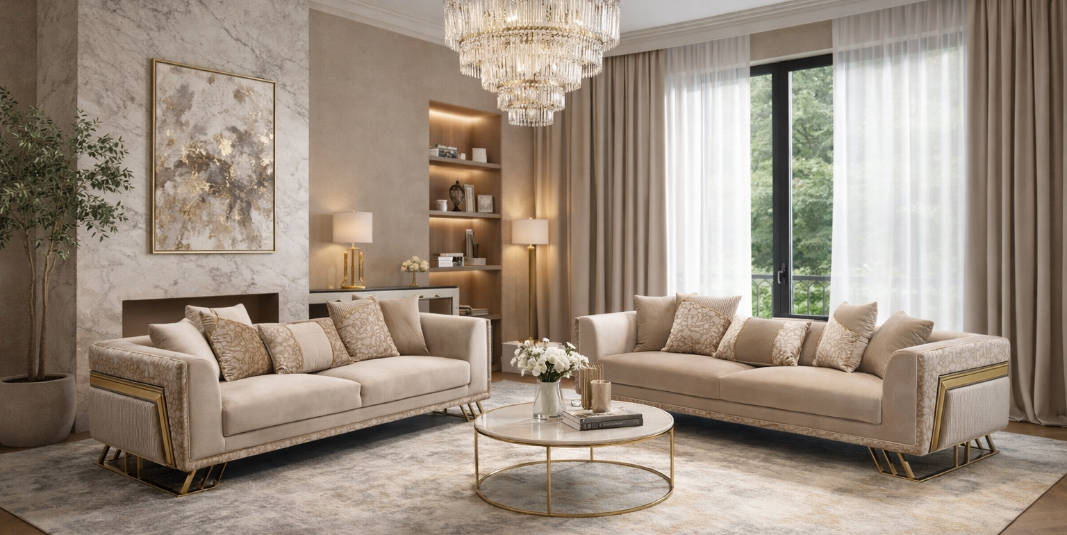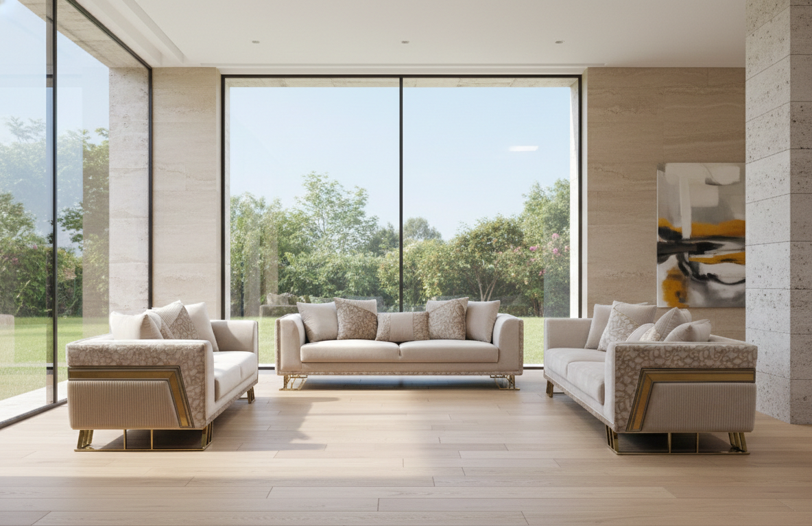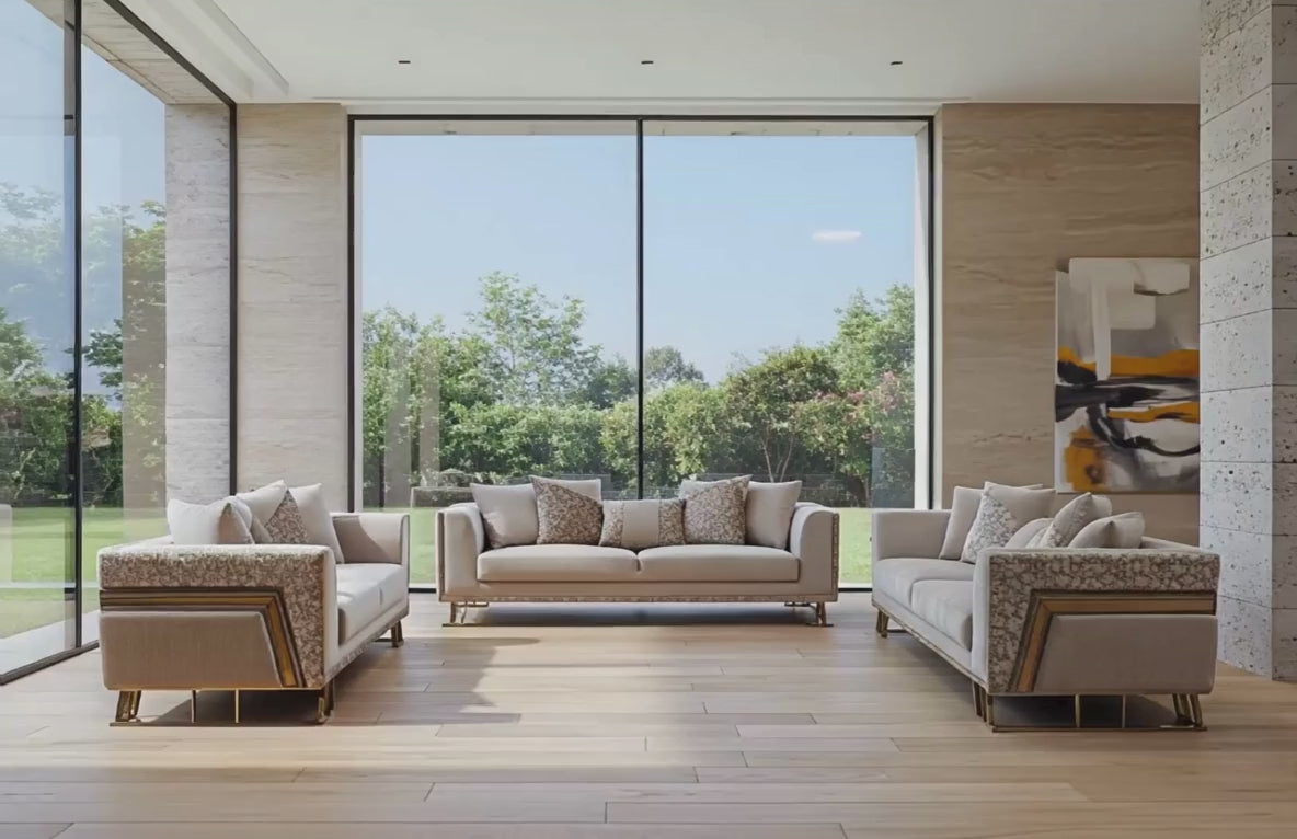 Calma Vivo is where quiet luxury meets living warmth. Wrapped in soft, neutral linens with delicate patterned panels and grounded on brass-finished legs, this sofa invites you to pause to laugh, cry, read, and hold the small moments that become memory. It’s not just a seat; it’s a place that remembers the shape of your day and cushions you through it.